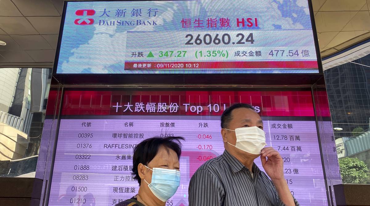 People stroll previous a financial institution’s digital board displaying the Hong Kong share index at Hong Kong Stock Exchange Monday, Nov. 9, 2020. (AP Photo/Vincent Yu)